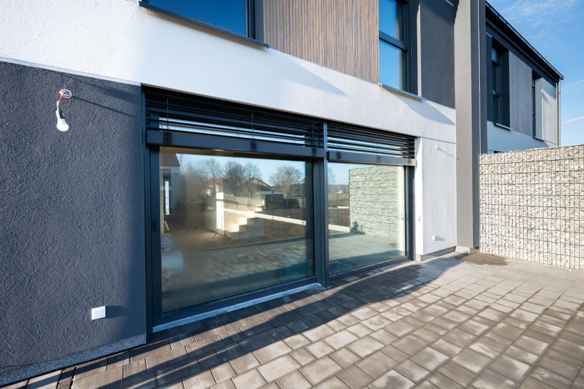 Okno w salonie w systemie HST, okno w salonie i kuchni z żaluzją fasadową