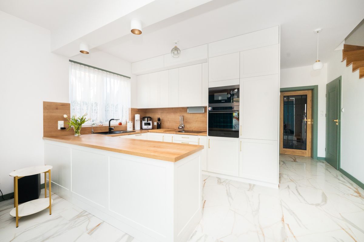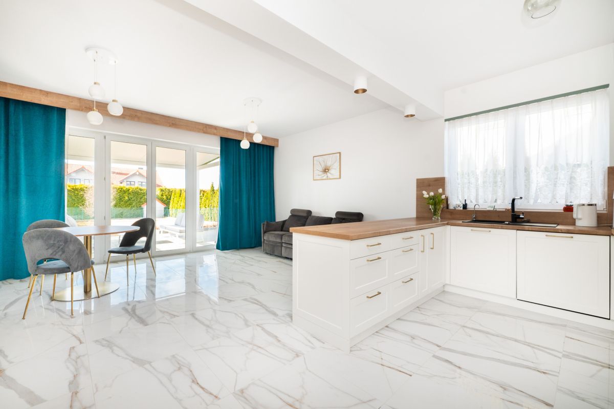 Parter - funkcjonalna strefa dziennaParter domu stanowi jasna i przestronna część dzienna. Salon, doskonale doświetlony dużymi przeszkleniami, płynnie łączy się z otwartą kuchnią, tworząc komfortową przestrzeń do codziennego życia i spotkań rodzinnych. Z salonu prowadzi wyjście na zadaszony taras, który stanowi naturalne przedłużenie strefy dziennej i sprzyja wypoczynkowi o każdej porze roku.