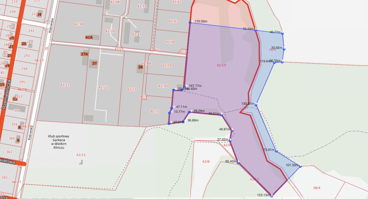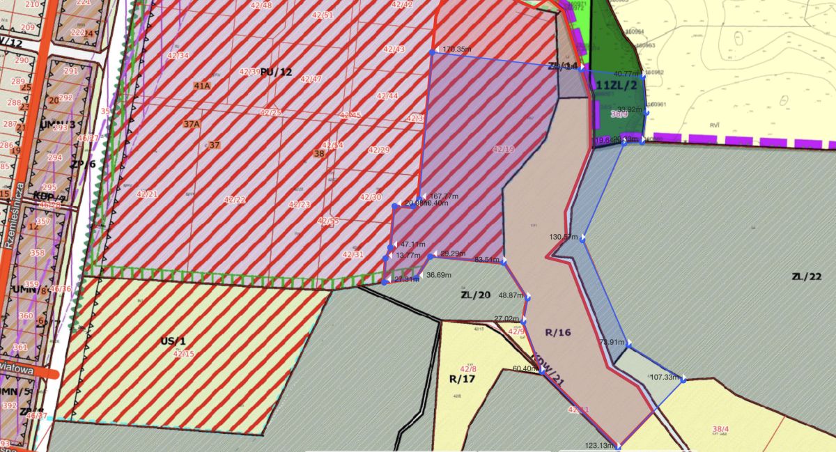 - Minimalna powierzchnia nowo wydzielonych działek budowlanych: 2000 m2 (wyłącznie dla zabudowy usługowej: 1500 m2);